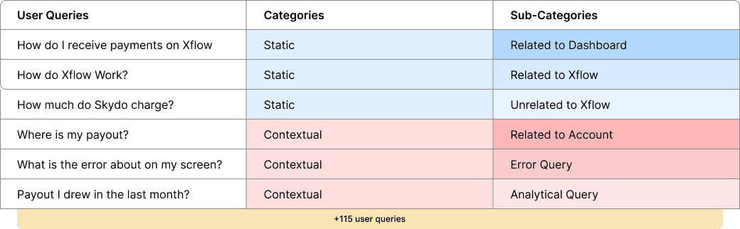 I categorized and sub-categorized each query to find patterns. The key finding: most queries weren't about understanding Xflow in general — they were contextual. Users were getting stuck mid-task, on screens they were already looking at, and reaching out to support instead of pushing through.