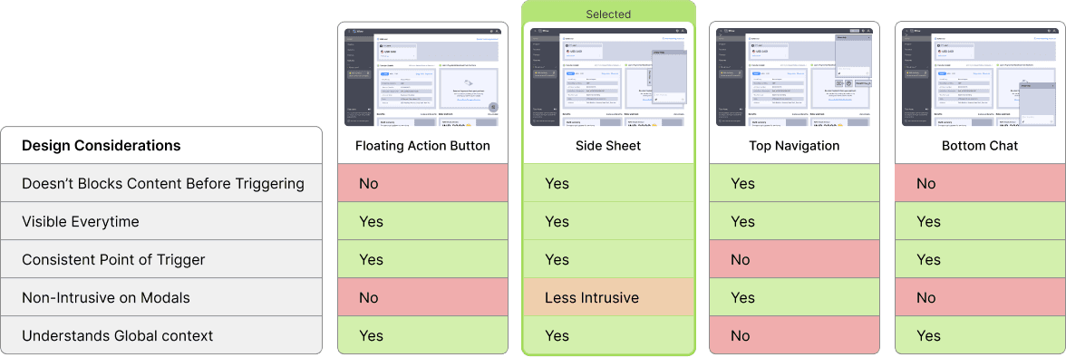 The chat window design was selected based on how effectively it satisfied the defined design considerations. Among the explored options, it addressed the highest number of key requirements, making it the most suitable direction for further development of the AI Help experience.